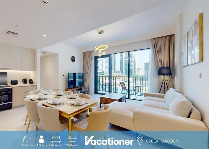 Просторные апартаменты Vacationer L Chic 2 Bedroom L Prime Location In Creek Harbour L Pool View Dubai – это отличный вариант для остановки в районе Дубай-Крик, в радиусе 7 км от Кидзаний.